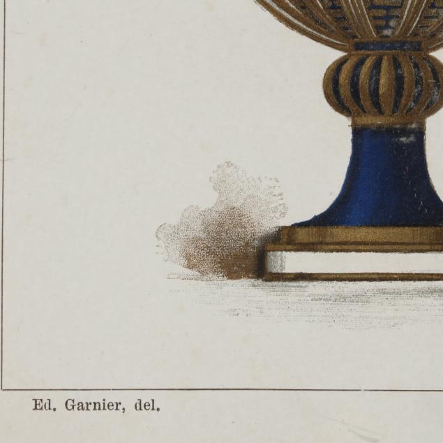 Late 19th/early 20th century, to include two hand-colored aquatints picturing architectural interiors, to also include two hand-colored chromolithographs illustrating Sèvres porcelain, matted and framed as two pairs.