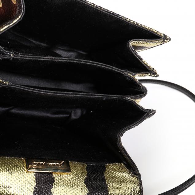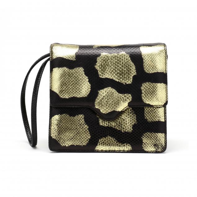 Presented in an eye-catching stylized python design of black and gold, this flap bag has a removable leather strap to create a stylish clutch, divided interior with mirror and coin purse.