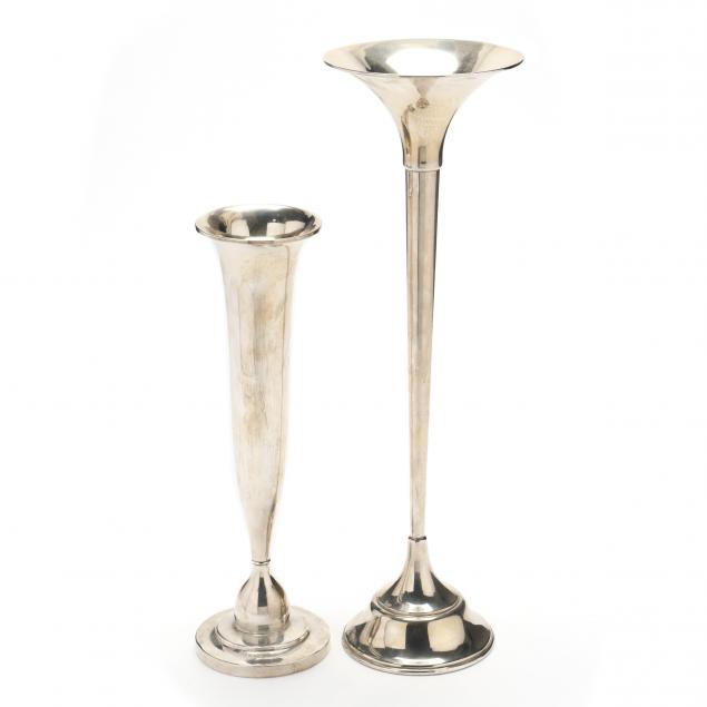 The tallest with mark of Matthews Company, pattern number 1696, with tapered thin body between a wide mouth and shaped pedestal base, no monogram (16 1/8 in.); the shorter with mark of Watson, pattern number B507/12, elongated hourglass form, between an everted mouth and domed tiered base, "E K" monogram to body. Both with weighted bases (12 1/8 in.).