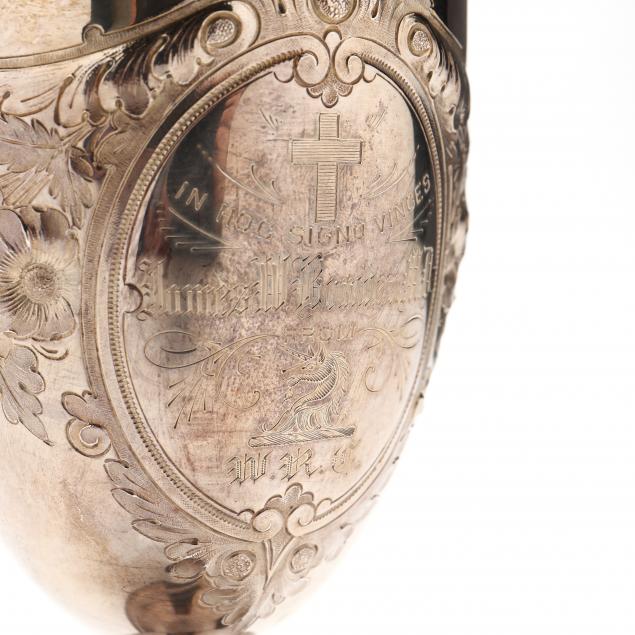 Mark of Wood & Hughes, pattern number 4, mouth and base rims with beaded borders, the cup body with repoussé floral decoration issuing around an oval cartouche with religious engraved dedication "(cross) / In HOC SIGNO VINCES / James W. Bowden M.D. / from / (Unicorn) / W. R.C."