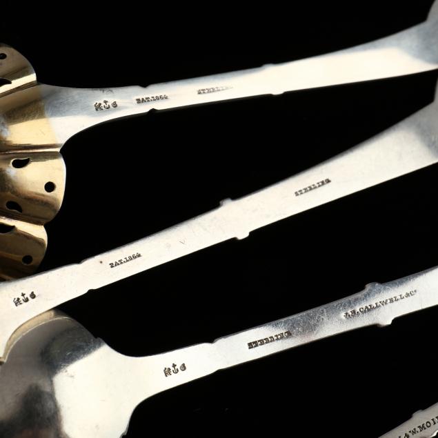 1864 patent, to include: (4) flat handle butter spreaders, all with retailer mark of Hart Bros. (7 1/2 in.); large and small sugar sifter, each with gilt wash to shaped bowl (7 3/4 in. larger); tablespoon with retailer mark of J. E. Caldwell & Co. (8 1/2 in.); sugar spoon with shell form bowl, retailer mark of George W. Webb & Co. (6 7/8 in.); (3) five o'clock teaspoons, two with retailer marks of John & William Moir of New York City, all without (4 7/8 in.); mustard spoon with worn retailer mark (5 1/4 in.). The five o'clock teaspoons and sugar spoon without monograms, all others with various monograms.