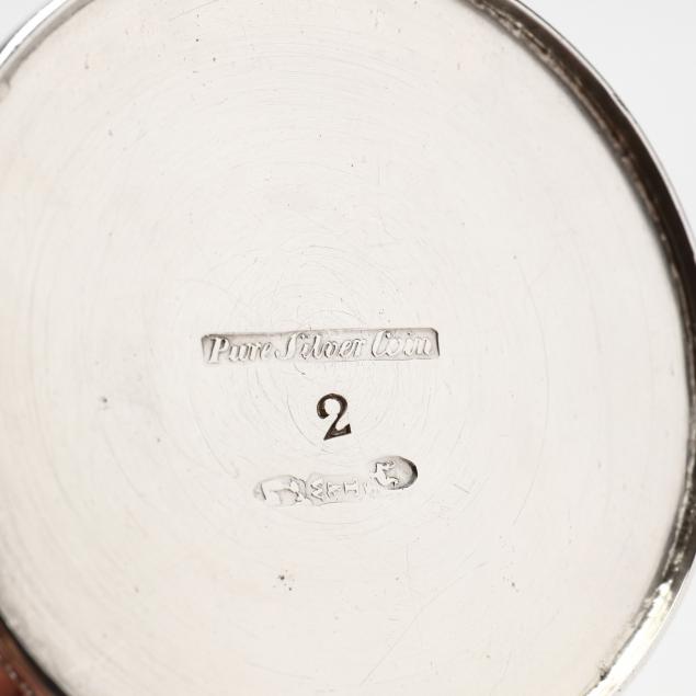 The first with mark of Tift & Whiting, also marked "Pure Coin Silver" and with the model no. 2, cylindirical form with slight taper, applied handle, the front with floral and foliate cartouche around the engraving "E. L. / Decr. 24th 1853 / 'Forget me not.'" (3 1/2 in.) (stable seam separation at top of handle); the second is unmarked but tests silver, with hand-chased landscape scene to body in the style of Kirk, no monogram or engraving (3 1/2 in.) (minor shallow dents to body).
