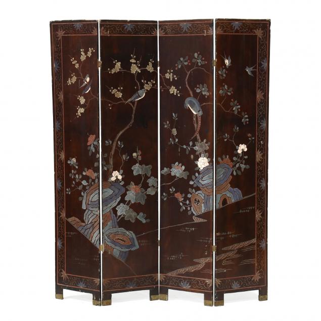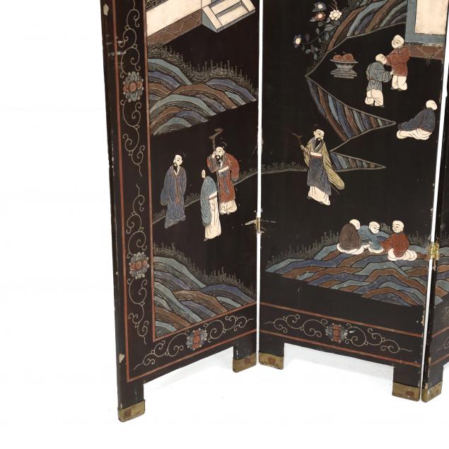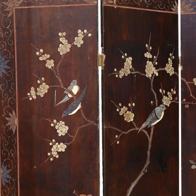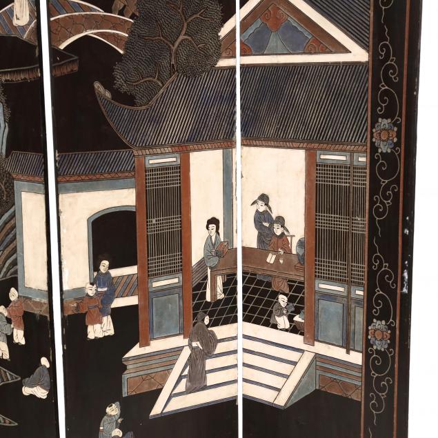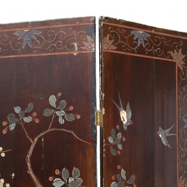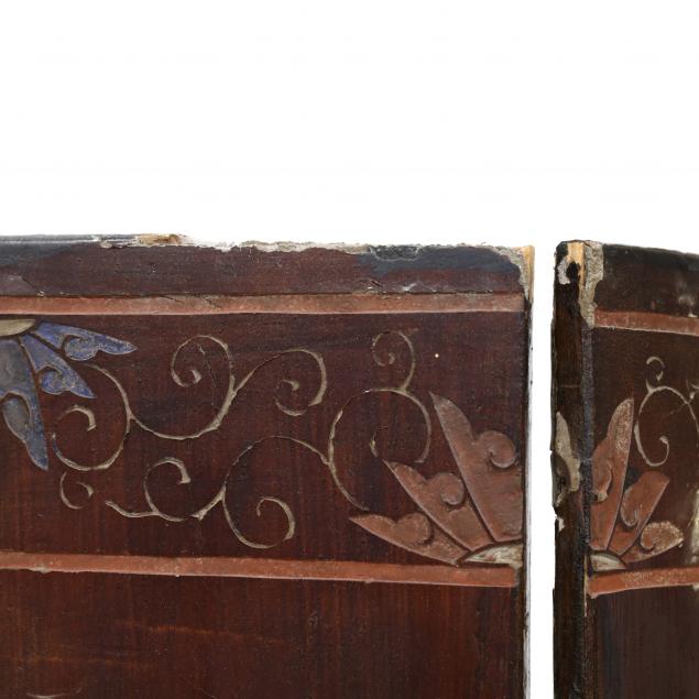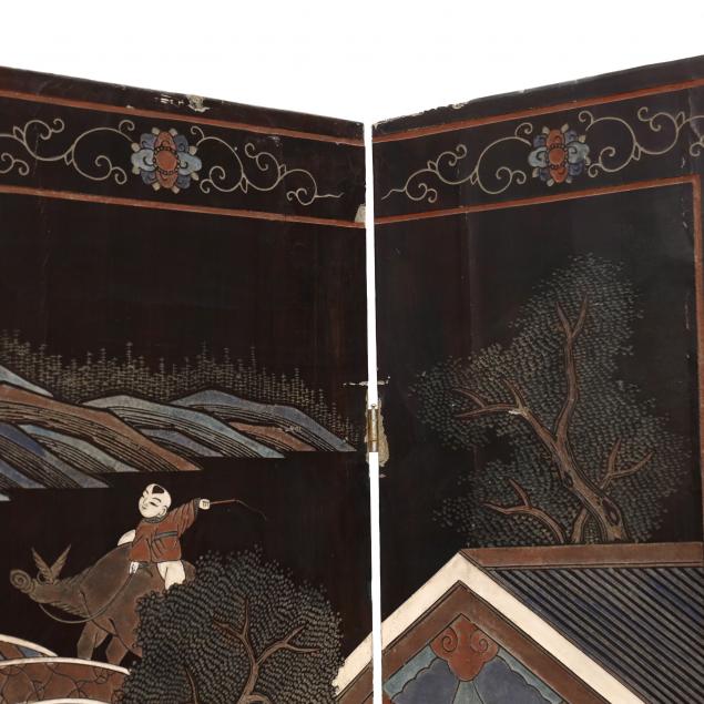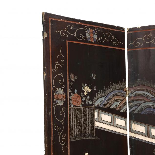 From the Collection of Mr. & Mrs. Julius J. Chamberlain, Jr., Charlotte, North Carolina Later hinges; edge chips and lacquer loss; areas of rubbing; the left screen with hairline crack visible from verso near top; other surface cracks to lacquer throughout.