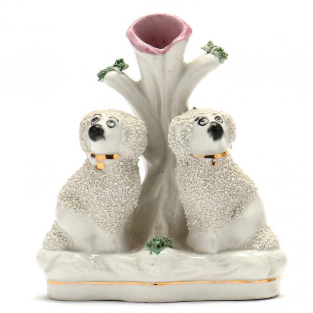 Early 19th century facing pair of sheep modeled on naturalistic bases, textured bodies (5 1/4 in.) (good condition with some texture lacking from the ram's mid-section); late 19th century dogs flank a spill vase, stamped "England" on the underside