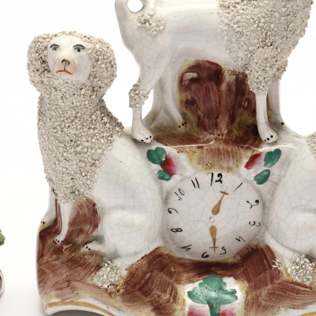Second half 19th century, to include; (10) miniatures, three of which are facing pairs, all posed holding baskets in their mouths (good condition overall; dog with bird has tight hairlines); and a figural of three dogs surrounding a painted watch face (8 x 7 x 2 1/4 in.) (crazing; two firing lines to the underside; dog with flowers has three petal breaks).