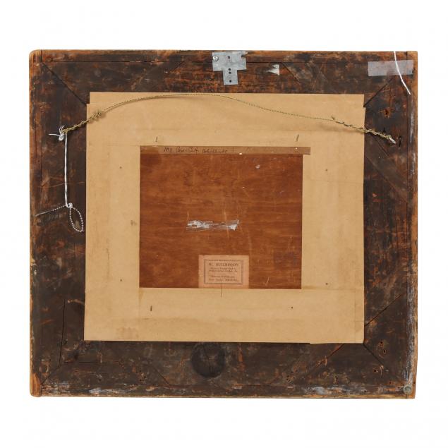 Oil on canvas laid on board, inscribed and signed to the verso, presented in a period gilt composition frame.