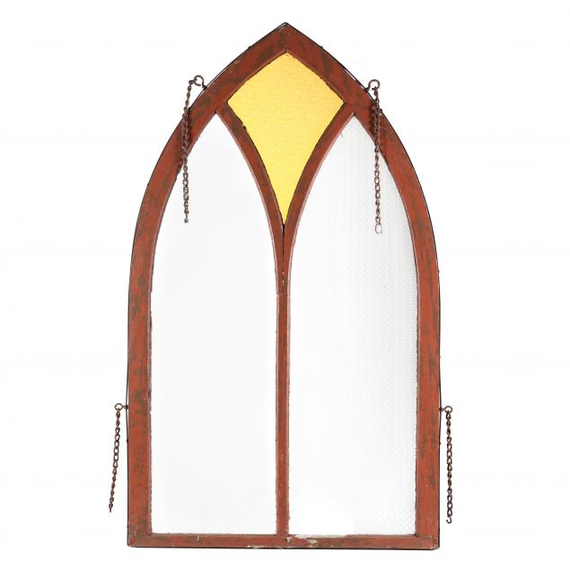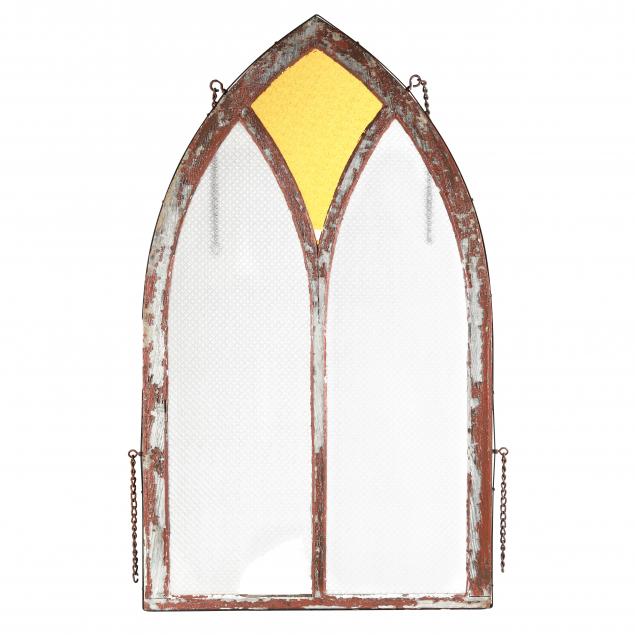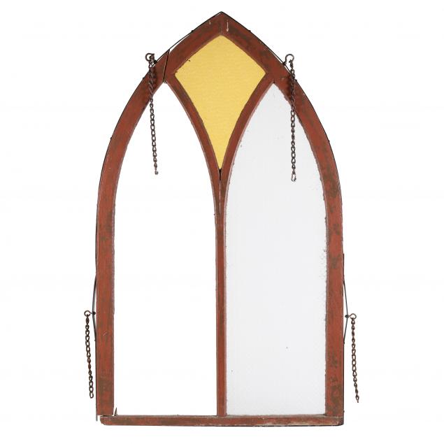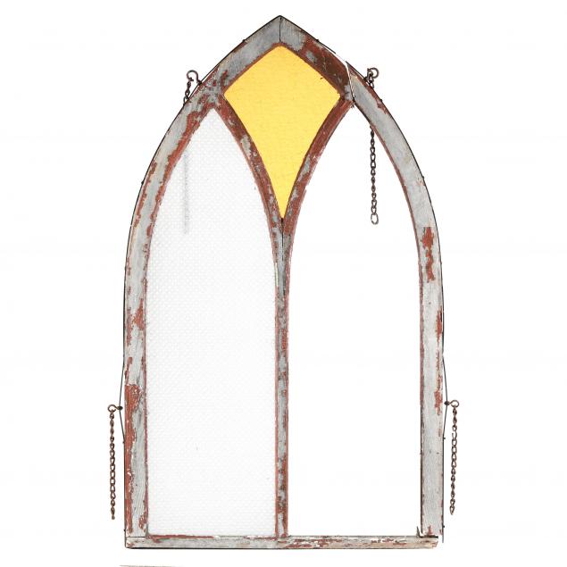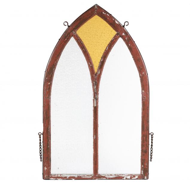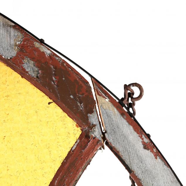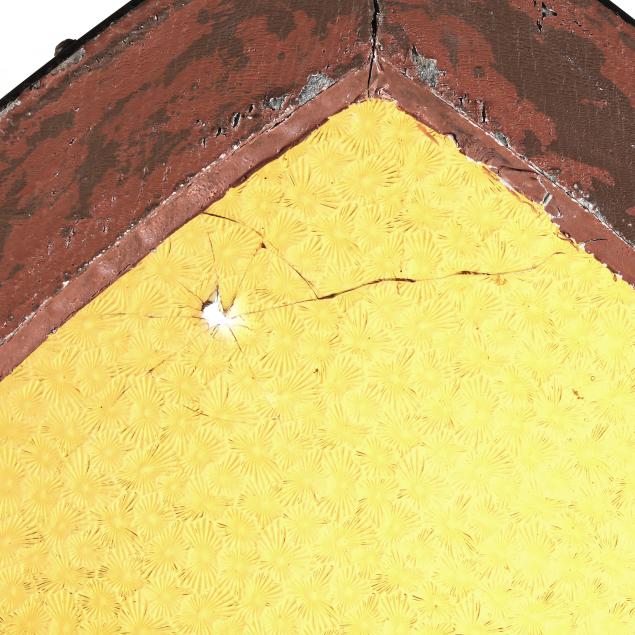 Fair condition; one with hole and cracks to upper amber glass panel; one with cracks and loss to one clear glass panel; one missing a clear glass pane.
