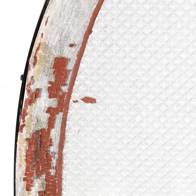 Early 20th century, painted wood frames with later custom iron strap surround and suspension chains, with amber and clear textured glass panes.