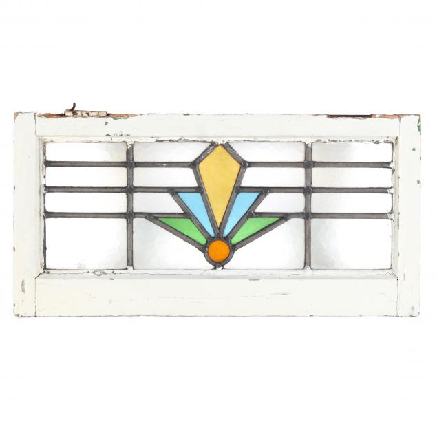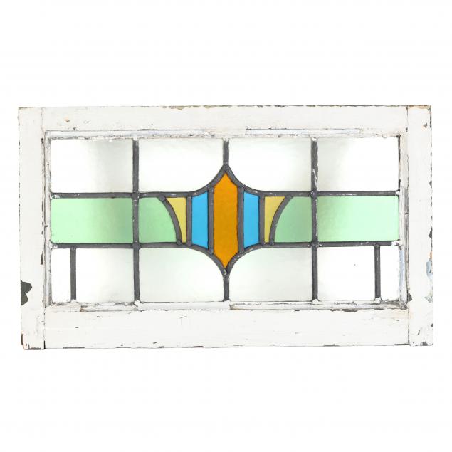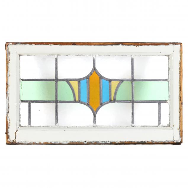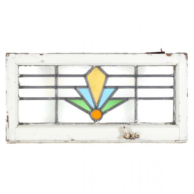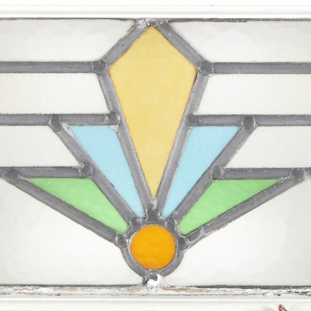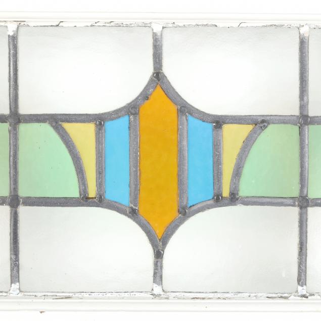 Early 20th century, white painted wood frames, multi color designed leaded glass panels.