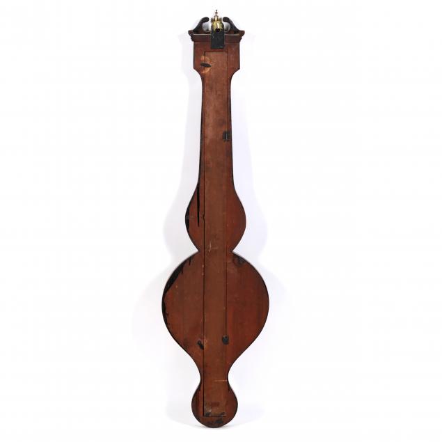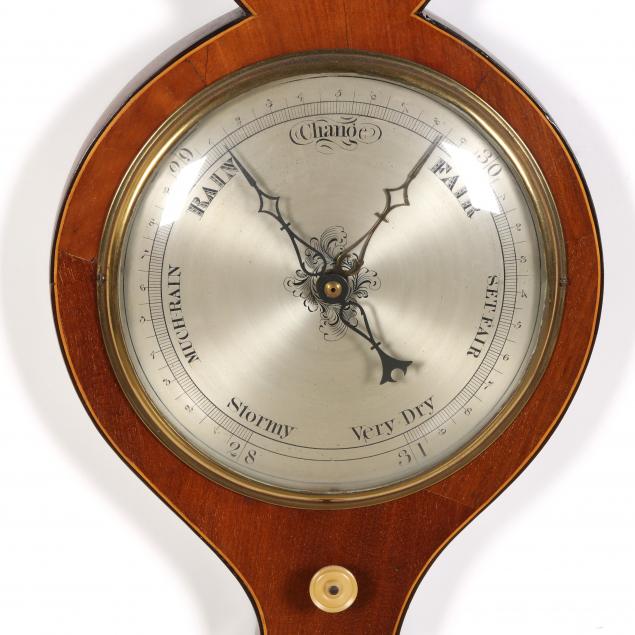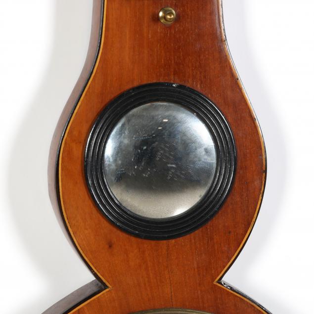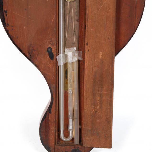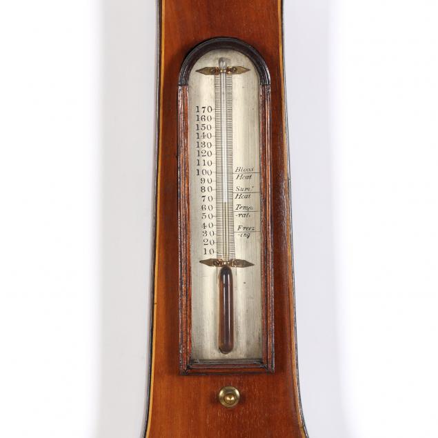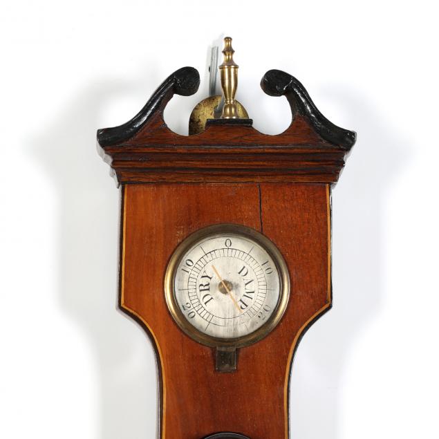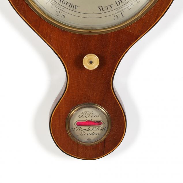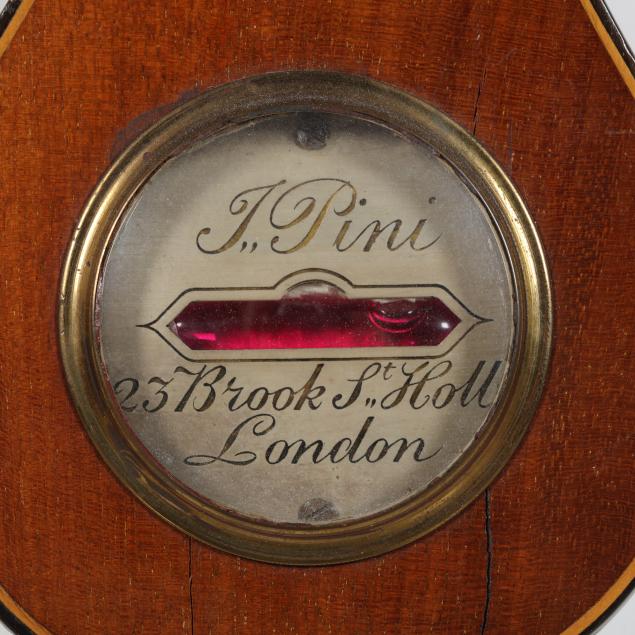 Circa 1838-48, London, mahogany case with light wood line inlay, broken arch pediment with brass final, the case with dry / damp hygrometer, archway alcohol thermometer, center convex mirror mount, above a large round main dial and spirit level, each behind glass; spirit level marked "J. Pini, 23 Brook St, Holb., London." Contains mercury.