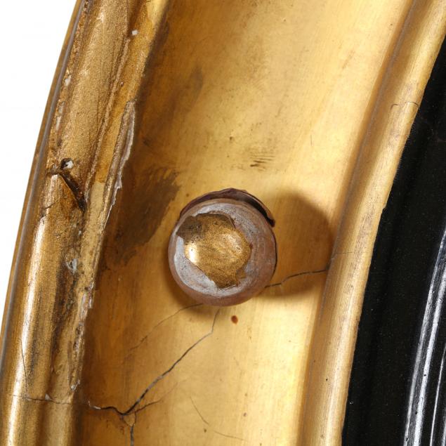 Circa 1820, circular convex mirror plate within an ebonized reeded slip, surrounded by a gesso and gilt cove molded frame with spherical mount decoration, perched spread-winged eagle crest flanked by scrolling acanthus leaf swag, with foliate and floral pendant apron, appears unmarked.