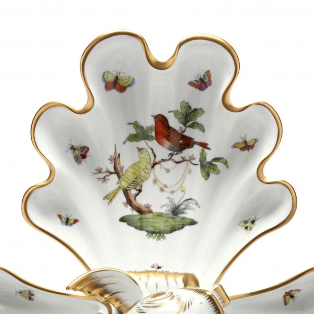 Impressive three section scalloped serving dish, gilt edged, the bowls hand-painted with birds and butterflies, surmounted by a stylized dolphin in the center, underside with Herend stamp #7448.