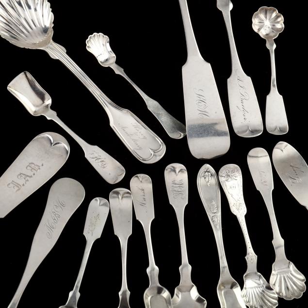 Most with various monograms, shell form pieces to include: a Gorham .800 silver gravy ladle (7 3/4 in.); serving spoon with mark of Hall, Hewson & Brower, Albany, New York, active 1846-1852, retailer mark of Mulford & Wendell (9 1/8 in.); spoon with mark of Taylor & Lawrie, Philadelphia, active 1837-1870s (6 1/2 in.); spoon with mark of Norton, Seymour & Co., Syracuse, New York, c. 1854-1857 (6 3/8 in.); spoon with mark of Alfred J. Evans, Binghamton, New York, active 1831-1850 (6 1/4 in.); ladle with mark of A. Corwin (5 5/8 in.); spoon with mark of James Watts, Philadelphia, active 1832-1888 (6 3/4 in.); (2) bright cut salt spoons with mark of James Watts; salt spoon with mark of B & M'C; salt spoon with worn mark of likely E. & D. Kinsey, Cincinnati, Ohio, active 1844-1861.