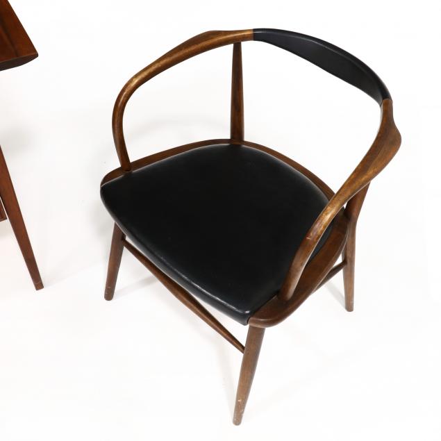 1960s, walnut veneer, rectangular top with inset slate type composition top, two flush drawers with recessed pulls, straight tapered legs, finished on all sides (29 x 54.5 x 24 in.); together with a walnut bentwood armchair with black naugahyde upholstery, labeled Boling Chair Co. (27 x 21 x 17 in.); desk unmarked.
