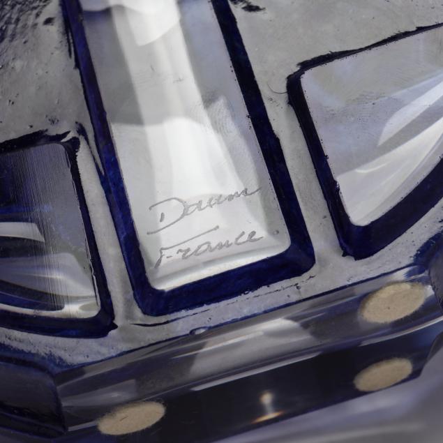 France, contemporary, mottled cobalt with polished raised clear panels, signed.