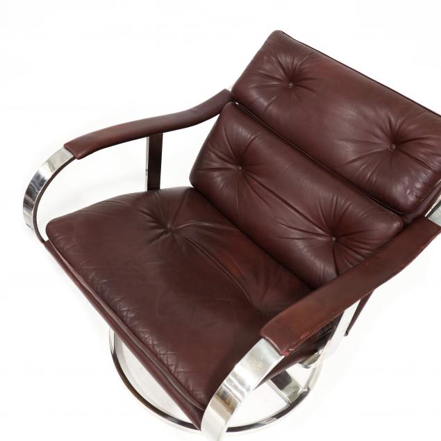 1985, heavy polished steel frames with original reddish brown leather fixed cushions, swivel base, labeled.