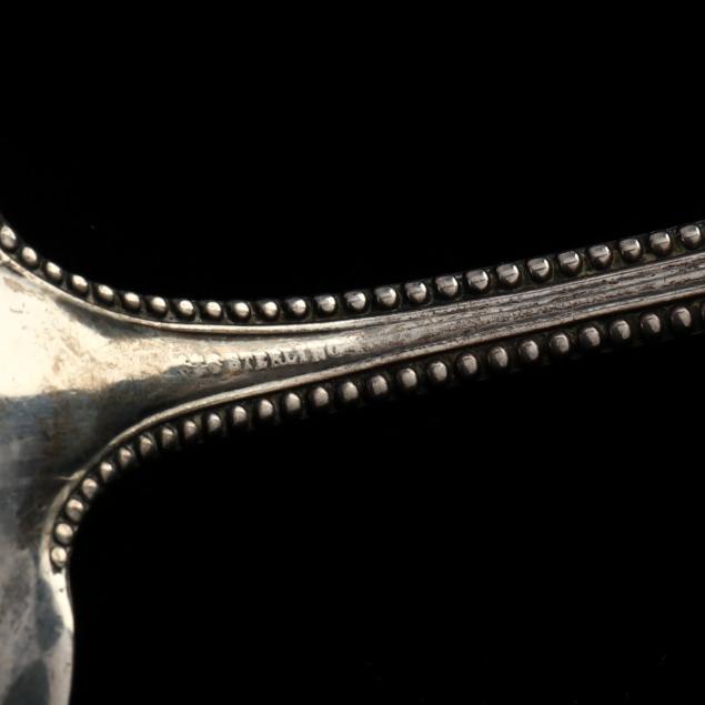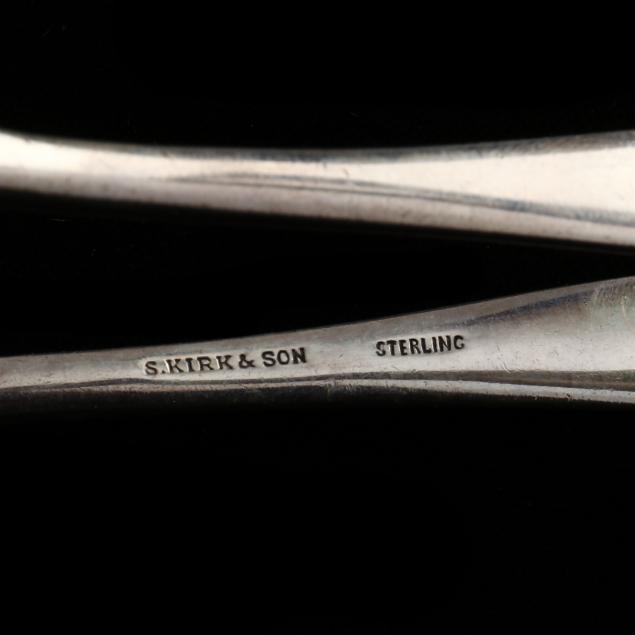 A pierced serving spoon in beaded pattern, pierced shell form bowl worn maker's mark (9 in.); sugar spoon with mark of Whiting, pattern number 18, with shaped bowl (6 1/4 in.); a pair of ice tongs with mark of S. Kirk & Son, shell form bowl (6 3/8 in.); grape shears with mark of Roger Williams Silver Co., pattern number 48, grape cluster and vine motif handle (6 1/2 in.). All without monograms.
