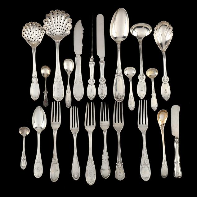 (39) pieces including: (12) assorted forks; (4) teaspoons; butter spreader; (6) assorted tea knives; (2) master butter knives; (8) master salt spoons; sugar shell; (2) sugar sifters; tablespoon; parcel gilt mustard ladle; and sauce ladle. Various manufacturers and patterns, 19th century, majority with monograms.