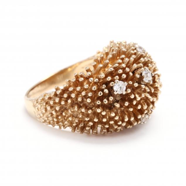 The dome ring in a stylized anemone motif set with five old European cut diamonds weighing approximately .27 total carat (I-J color, SI-I clarity), testing 14KT.