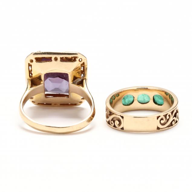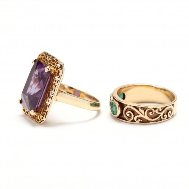 The first centering on a rectangular color change sapphire (14.5 x 12 mm) prong set and with Greek key motif to surround, stamped 14K and with maker's mark VN (19.6mm; ring size 5.25); the second a band with scrollwork motif and set with three oval cut emeralds weighing approximately 1.0 total carat, stamped 14K (6.5mm; ring size 5.5).