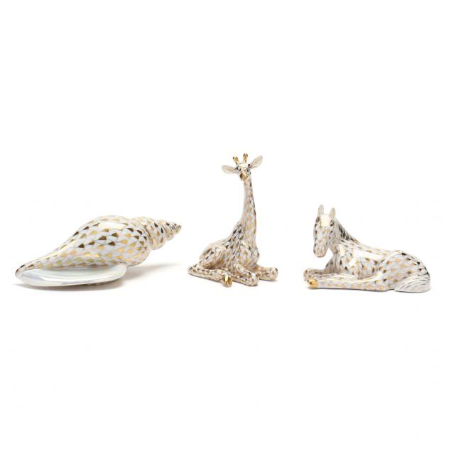 All with parcel gilt fishnet: a First Edition shell #15535; a Herend Guild foal lying down #15451 in original box; a Herend Guild giraffe sitting #15471 in original box.
