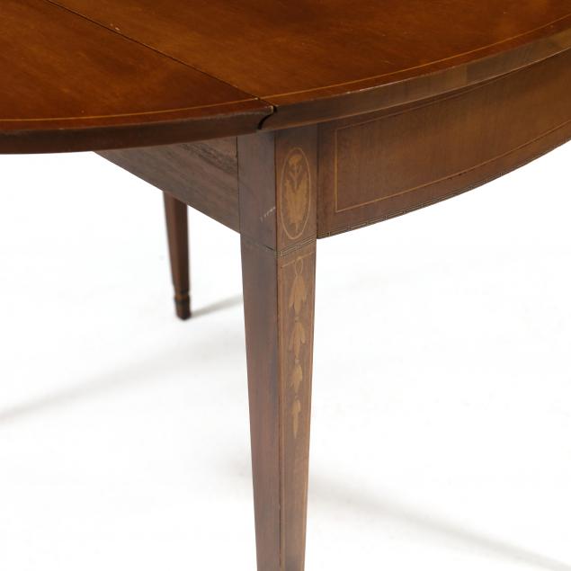 Late 20th century, label to underside, demilune drop leaves with single butterfly support, square tapered legs with graduated bellflower inlay.