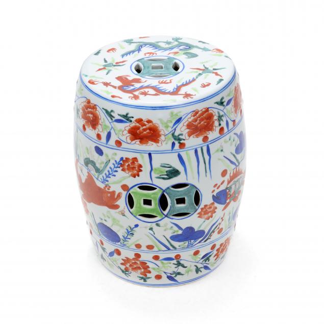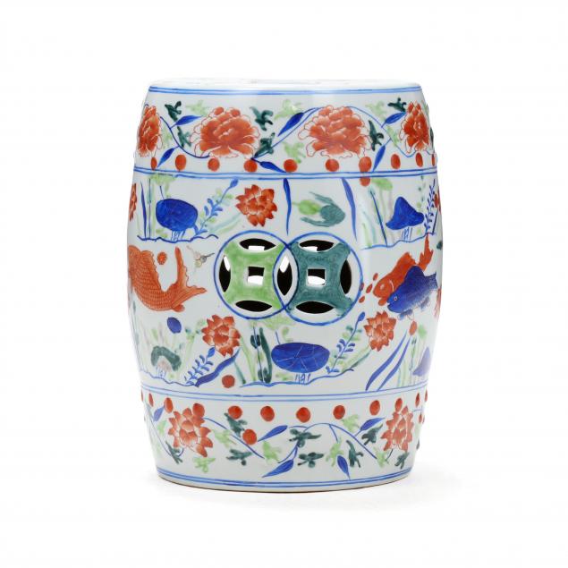 Late 20th century, porcelain decorated in the Ming style with fish amid water plants, two bands of chrysanthemums above, reticulated double coin motifs to the sides.