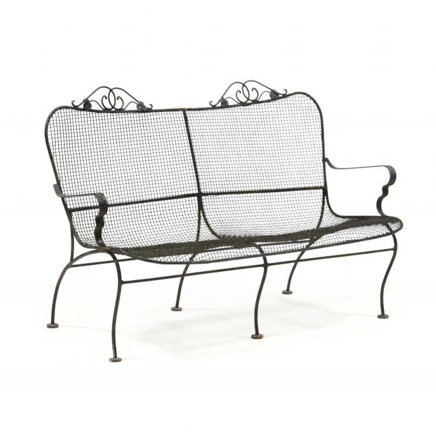 Circa 1950, black painted iron, including a settee (34 x 51 x 30 in.); two armchairs (35 x 23 x 31 in.), and two side chairs (35 x 19 x 30 in.), unmarked.