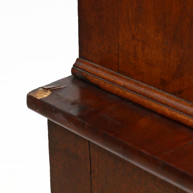 From the Estate of the late Ann M. Vaden, Greensboro, North Carolina Fair condition: both elements are old but are a marriage; pediment with losses to applied dentil trim, veneer buckling to frieze; four cracked glass panes; astragal molding chips and losses throughout; waist board with staining, scratches and veneer chips; fall-front drawer with loose pull and veneer lifting, drawer divider has separated and is now projecting at the left end; drawers and surrounds with chips and cock beading loss; shrinkage cracks to sides of case.