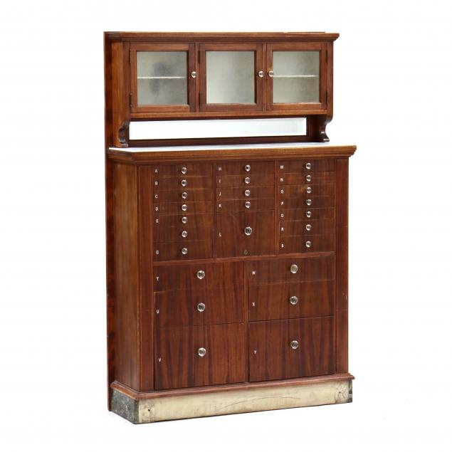 Circa 1900, one-part form, mahogany veneer, upper recessed cabinet with three hinged "etched ice" glass pane doors with painted metal lining and two milk glass shelves, beveled mirror backsplash, milk glass preparation surface, the case with (25) flush drawers, green marble kick-board base.