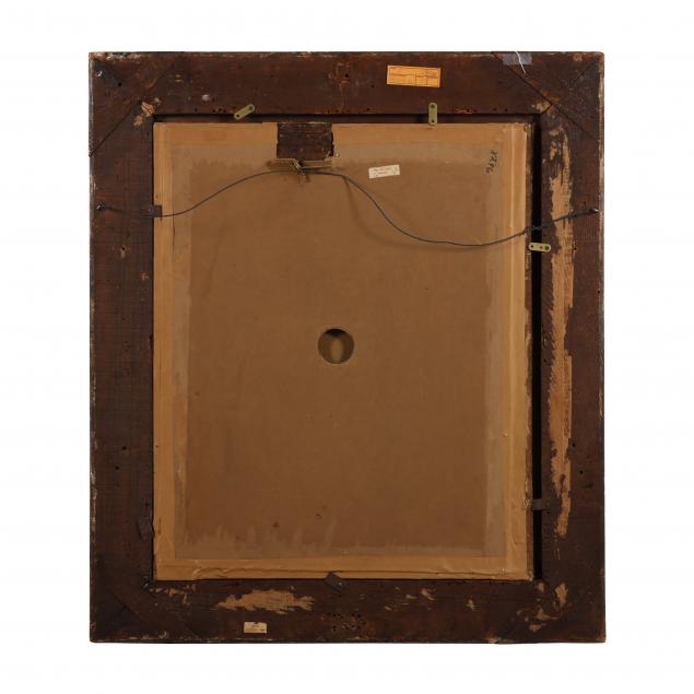 Stretcher marks; several small paint flakes around perimeter of painting; allover stable craquelure; edge wear to canvas, primarily along left edge of canvas, with some associated paint and canvas loss; areas of retouch and obscuring varnish visible under UV light; minor loss and rubbing to frame.