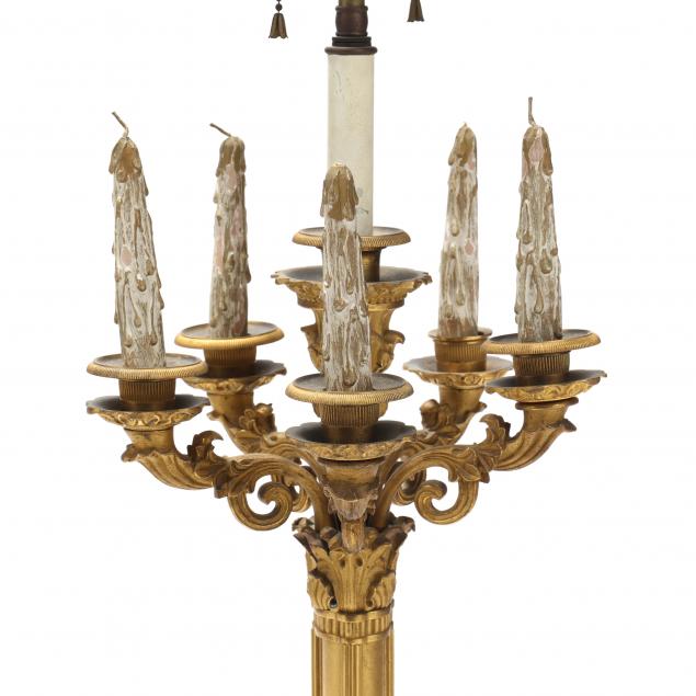 Late 19th century, six light form, five unfurling foliate branch arms issue from a central vertical standard now electrified as dual socket lamp, each sconce having a scalloped foliate drip pan and removable bobeche, and wooden faux candlesticks, supported by a tall column with three reeded pilasters and foliate mounts, tripodal base with garland and scrolling foliate motifs, appears unmarked. Includes pleated silk shades.