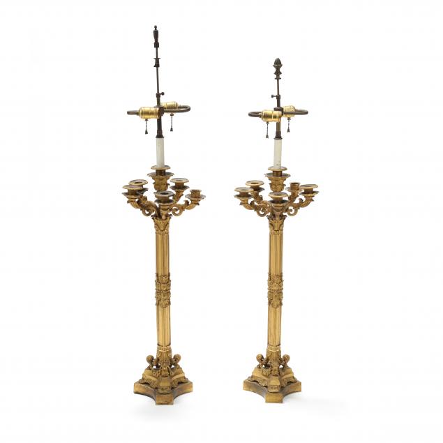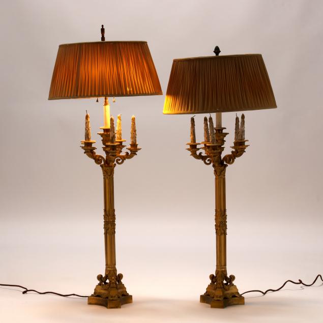 Private Collection, Durham, North Carolina Some scattered rubbing and spotting to gilt; each lamp missing one bobeche; some mis-shaping to one bobeche; later mismatched finials; some tears and age toning to shades; one lamp not operational.