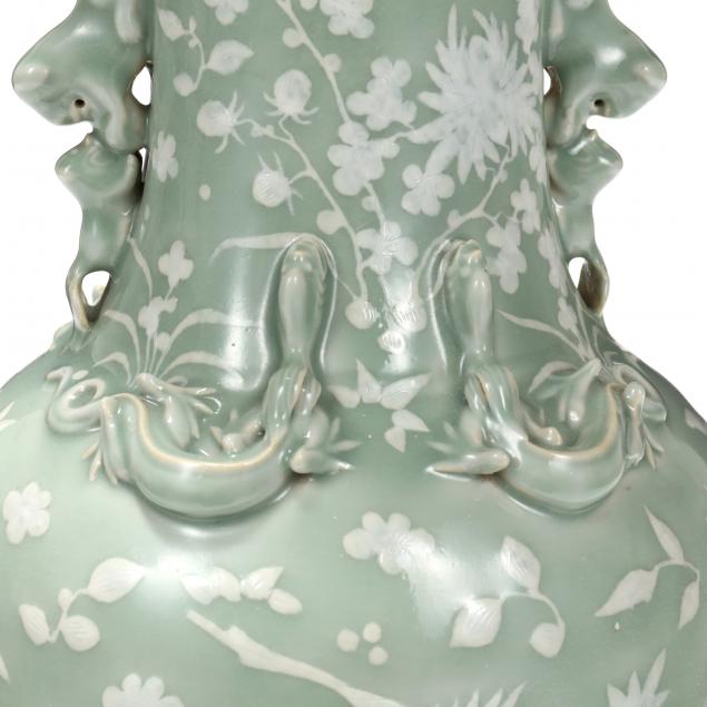 20th century, tall vase with large open mouth having scalloped edges, low relief decoration in white of birds amidst plum blossoms, peonies, and water lotuses, chilong dragons long the shoulder and pairs of foo lions in high relief flank the neck, comes together with an elevated carved wooden stand.