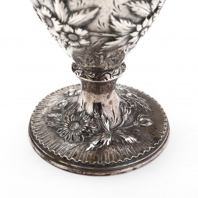 Early 20th century, pattern number 114, baluster form with castles, trees, houses and flowers against a stippled ground, ram's head to chased handle, period monogram "KDG."