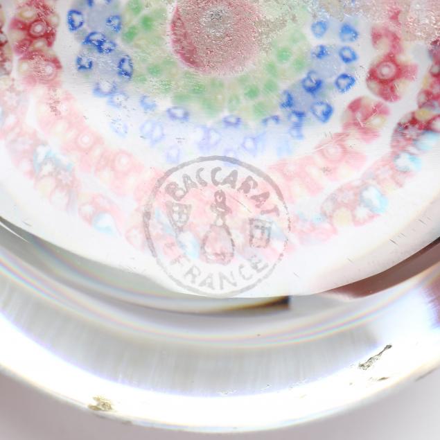 France, the larger an interwoven millefiori of yellow and light blue / pink with central green and pink design on a clear/white spiral cane ground (2.75 in.), together with a smaller weight with four bands of pink/blue/green millefiori with central pink cane (2.5 in.), both with acid stamp.