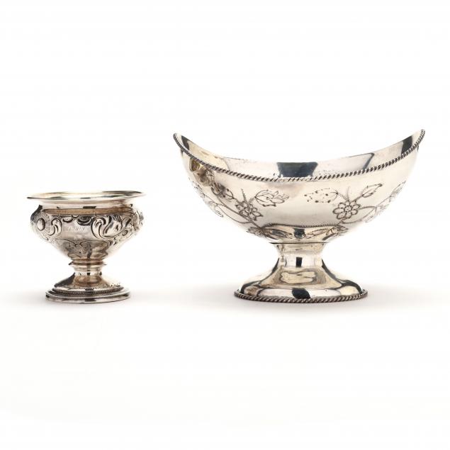 The bowl mark of William Gale & Son, New York City, active 1850-1866, with rope form rim and chased floral design, without monogram (4 1/4 x 6 3/8 x 4 7/8 in.); master salt with repoussé scrolling floral designs and gilt wash interior, the front and back cartouches with monogram and date of 1854, otherwise appears unmarked (acid tested silver) (2 5/8 x 3 in.).