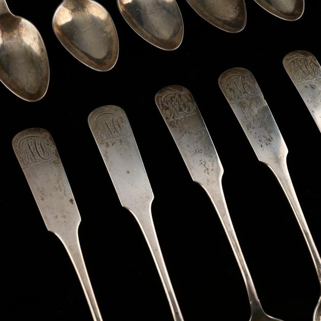 To include: a set of six five o'clock teaspoons with mark of John D. Haverstick, active in Lancaster, Carlisle, and Erie (1805-1826), each with matching period script monogram (5 5/8 in.); a set of six coffee spoons with the mark of George Hendel, active in Carlisle (1802-1840), each with matching period script monogram (5 1/8 in.). Presented within a later forest green fitted case.