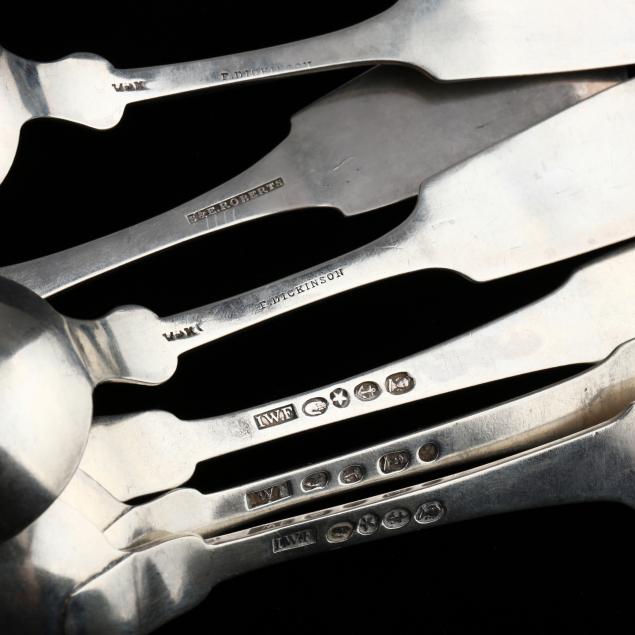Including: (3) with mark of John Wolfe Forbes, New York City, active 1802-1831 (7 1/4 in.); a pair with mark of Wood & Hughes, both with retailer mark of F. Dickinson (7 in.); a single place spoon with mark of Samuel and Edmund Roberts, Trenton, New Jersey, active 1844-1882 (7 1/4 in.). All with various monograms.