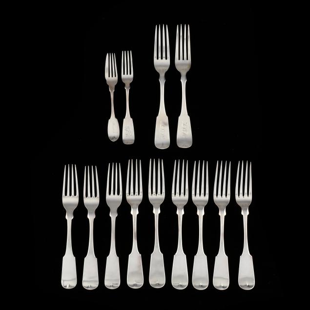 Including a set of (6) forks with mark of "J. Rafel," possibly for the New Orleans silversmith and retailer, Joseph Rafel, active 1850-1862 (7 1/2 in.); (3) forks with mark of Andrew Comstock Benedict, New York City, active 1828-1888 (7 1/4 in.); (2) pastry forks, one marked "Coin" (5 3/8 in.), the other with mark of Charles F. Hill, Oswego, New York, active 1852-1880 (5 1/4 in.). All with various monograms.