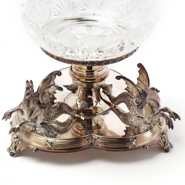 Circa 1900, both with mark of Marples & Co., baluster centerpiece supporting a removable round cut crystal bowl, atop a trefoil mirrored stand with three twisting mythological hippocampus figures, raised on figural mask feet, comes together with faux boxwood topiaries, without monograms.