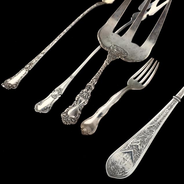 Various patterns, pieces without monograms include: a large serving spoon (12 5/8 in.); short handled serving fork (7 1/2 in.); cheese scoop; serving spoon; (2) lettuce forks; (3) olive spoons; infant fork; "Louisville, Kentucky / Daniel Boone" souvenir spoon.