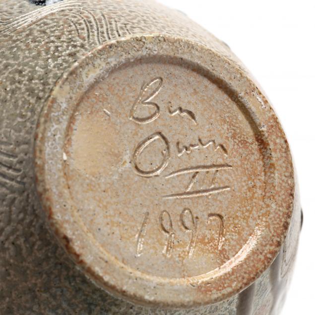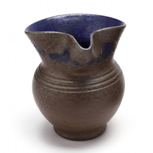The first is a stoneware small pitcher with cobalt decoration, made at Ben Owen Master Potter shop (4 1/2 in.); the second is a Japanese translation vase Oribe and salt glazed (8 1/2 in.)