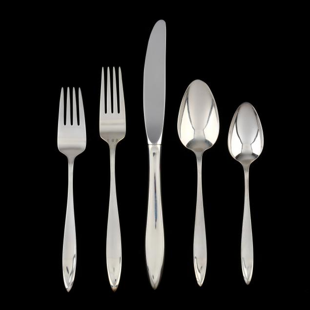 (57) pieces, service for twelve, including: (12) knives (9 in.); (12) forks (7 3/8 in.); (13) salad forks; (12) teaspoons; (6) dessert / oval soup spoons; tablespoon; and serving fork. No monograms.