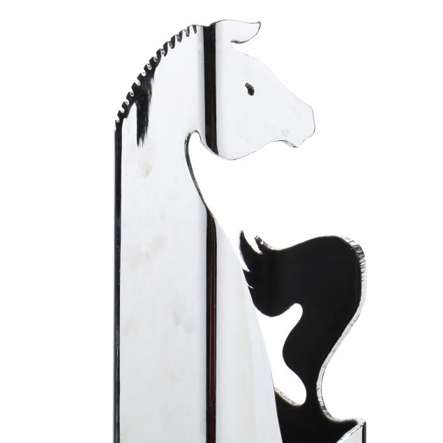 Chrome plated iron, abstract rectangular tower form of a horse, interior with incised '78 / A. L. Wilson / © 1968 artist stamp, mounted on a square wooden base.