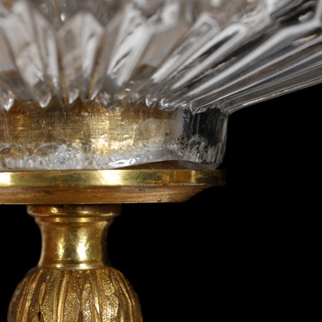 Early 20th century, three light form, molded glass sunburst shade with gilt artichoke drop, unmarked.