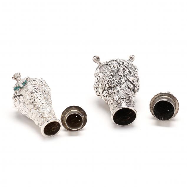 Including a taller single shaker in pattern number 4B (5 3/4 in.), the four others in pattern number 4A (4 7/8 in.), each with floral repoussé decoration on a stippled ground, raised on four scrolled feet. No monograms.
