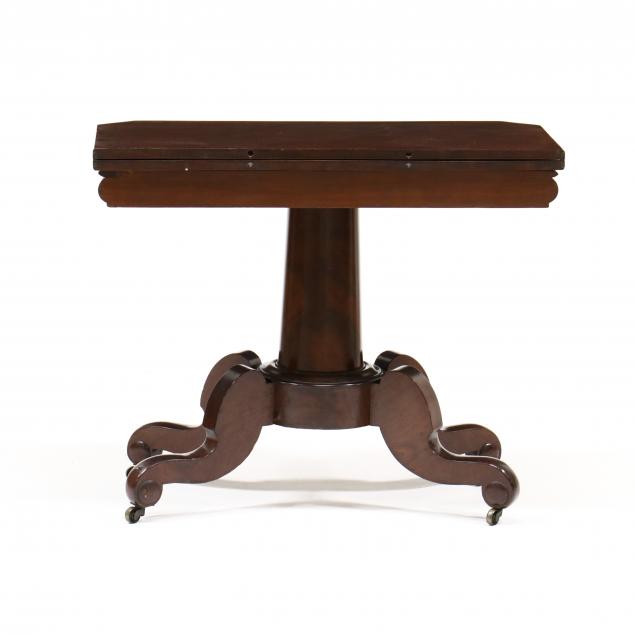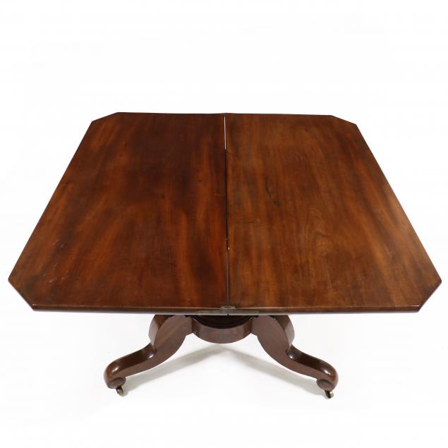Circa 1840, mahogany veneer, white pine and oak secondary, single board swivel hinged top, ogee apron, tapered columnar standard, quadruped base with scrolled legs, applied bosses, on casters.