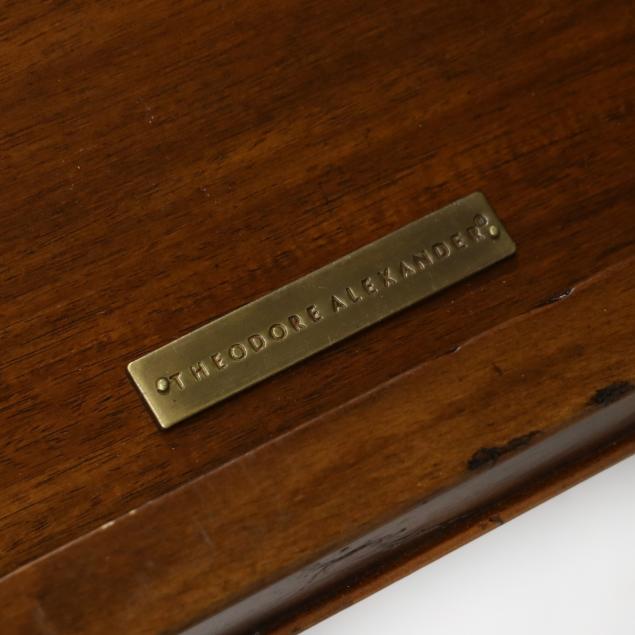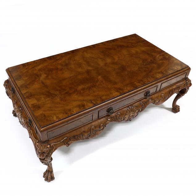 Late 20th century, flame mahogany veneers, rectangular top with book-matched veneers and banded border, each side with a small drawer, acanthus leaf and diapered carved skirt on cabriole legs with mask carved knee and hairy paw feet, labeled.
