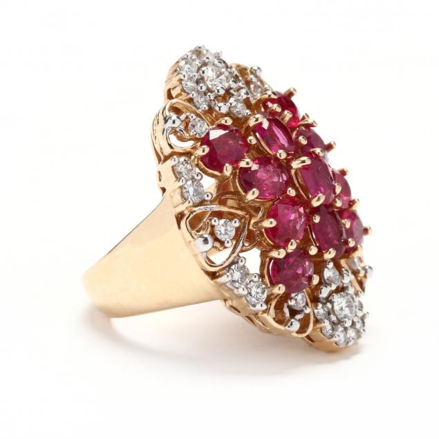 With a center cluster of prong set oval cut rubies weighing approximately 5.50 total carats and with full cut round diamonds weighing approximately 1.06 total carats (G-H color, VS-SI clarity) set to the shaped surround, on tapering shank stamped 14K and with a maker's mark.